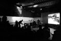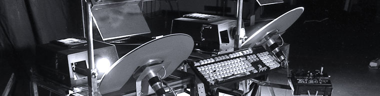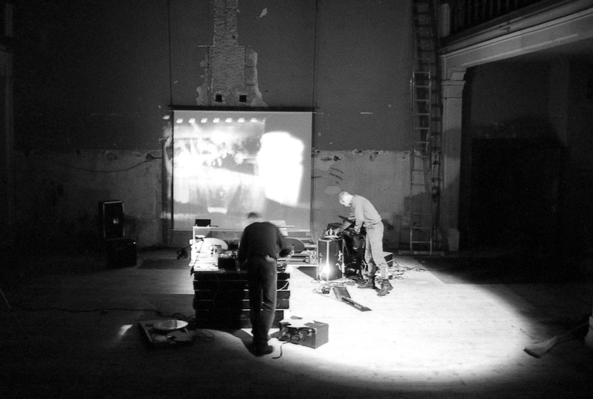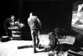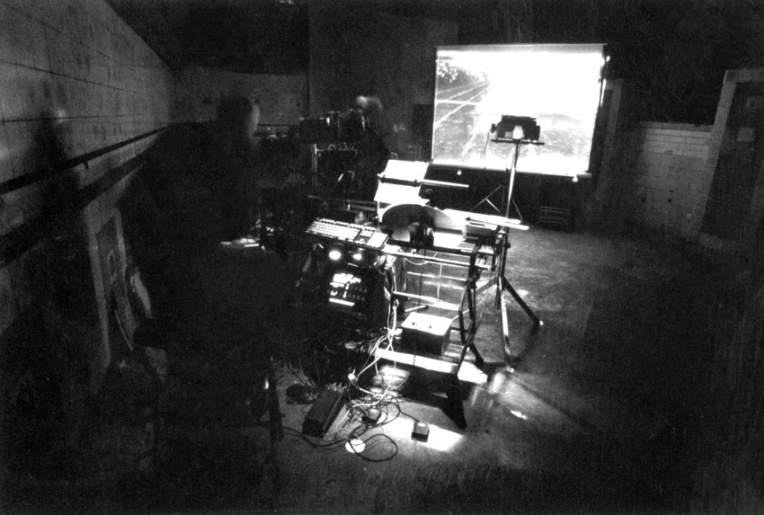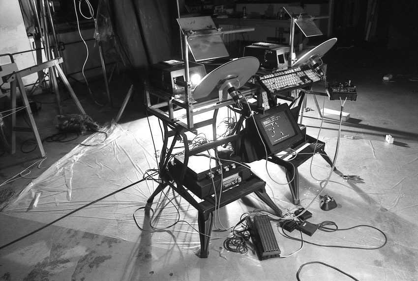 Par la suite, en atelier, chacun retravaille son matériau: expérimentations chimiques sur la pellicule et recadrage des images, altérations et recomposition des sons. Parallèlement à ces traitements, des machines sont créées; dispositif de projecteurs en balayage pour les images et régie de mixage pour les sons, commandée par une guitare électrique.